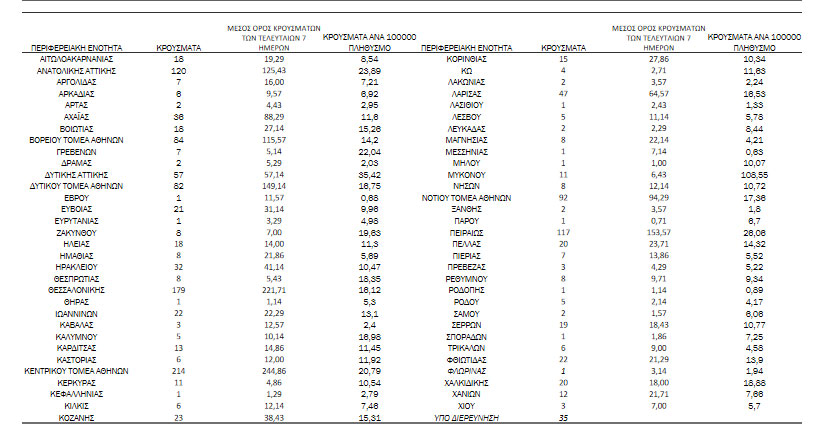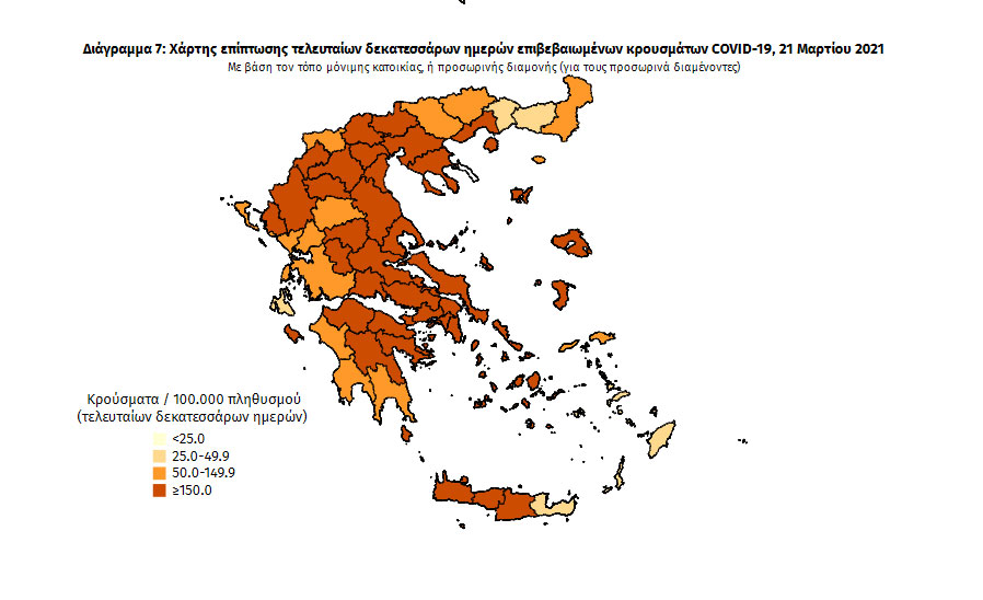 Γεωγραφική διασπορά: Ο χάρτης αποτυπώνει τη γεωγραφική κατανομή των συνολικών κρουσμάτων COVID-19 (από την αρχή της επιδημίας) ανά Περιφερειακή Ενότητα της χώρας, με βάση την δηλωθείσα διεύθυνση μόνιμης κατοικίας του ασθενούς, ή τη διεύθυνση προσωρινής διαμονής για τους τουρίστες και άλλους προσωρινά διαμένοντες στην Ελλάδα. Συμπεριλαμβάνονται τόσο κρούσματα με ιστορικό ταξιδίου (“εισαγόμενα”)όσο και κρούσματα με πιθανή εγχώρια μετάδοση.