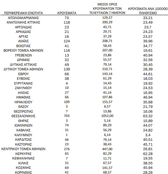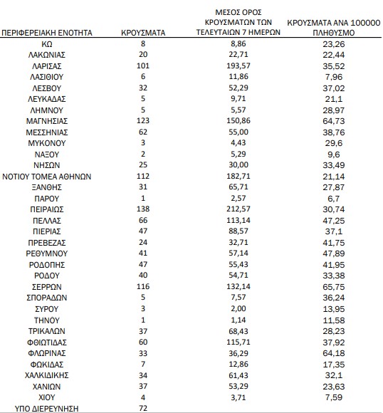 Υπενθυμίζεται πως τα περισσότερα σε αριθμό περιστατικά που είχε καταγράψει ο ΕΟΔΥ μέχρι σήμερα σε μία ημέρα ανακοινώθηκαν την Τρίτη 9 Νοεμβρίου 2021, όταν εντοπίστηκαν 8.613 περιπτώσεις σε ένα 24ωρο. Επίσης, ο μεγαλύτερος αριθμός θανάτων εξαιτίας του ιού σε ένα 24ωρο καταγράφηκε το Σάββατο 28 Νοεμβρίου 2020, όταν έχασαν τη ζωή τους 121 ασθενείς.