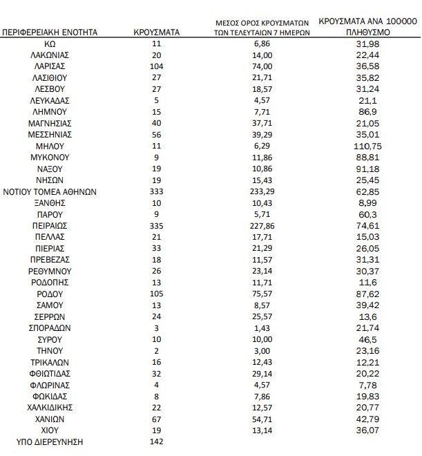 Υπενθυμίζεται πως τα περισσότερα σε αριθμό περιστατικά που είχε καταγράψει ο ΕΟΔΥ μέχρι σήμερα σε μία ημέρα ανακοινώθηκαν την Τρίτη 4 Ιανουαρίου 2022, όταν εντοπίστηκαν 50.126 περιπτώσεις σε ένα 24ωρο. Επίσης, ο μεγαλύτερος αριθμός θανάτων εξαιτίας του ιού σε ένα 24ωρο καταγράφηκε το Σάββατο 14 Δεκεμβρίου 2021, όταν έχασαν τη ζωή τους 130 ασθενείς.