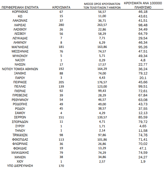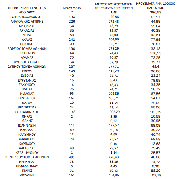 Υπενθυμίζεται πως τα περισσότερα σε αριθμό περιστατικά που είχε καταγράψει ο ΕΟΔΥ μέχρι σήμερα σε μία ημέρα ανακοινώθηκαν την Τρίτη 9 Νοεμβρίου 2021, όταν εντοπίστηκαν 8.613 περιπτώσεις σε ένα 24ωρο. Επίσης, ο μεγαλύτερος αριθμός θανάτων εξαιτίας του ιού σε ένα 24ωρο καταγράφηκε το Σάββατο 28 Νοεμβρίου 2020, όταν έχασαν τη ζωή τους 121 ασθενείς.