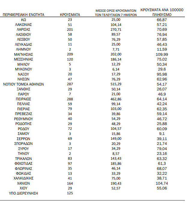 Υπενθυμίζεται πως τα περισσότερα σε αριθμό περιστατικά που είχε καταγράψει ο ΕΟΔΥ μέχρι σήμερα σε μία ημέρα ανακοινώθηκαν την Τρίτη 4 Ιανουαρίου 2022, όταν εντοπίστηκαν 50.126 περιπτώσεις σε ένα 24ωρο. Επίσης, ο μεγαλύτερος αριθμός θανάτων εξαιτίας του ιού σε ένα 24ωρο καταγράφηκε το Σάββατο 14 Δεκεμβρίου 2021, όταν έχασαν τη ζωή τους 130 ασθενείς.
