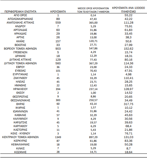 Υπενθυμίζεται πως τα περισσότερα σε αριθμό περιστατικά που είχε καταγράψει ο ΕΟΔΥ μέχρι σήμερα σε μία ημέρα ανακοινώθηκαν την Τρίτη 4 Ιανουαρίου 2022, όταν εντοπίστηκαν 50.126 περιπτώσεις σε ένα 24ωρο. Επίσης, ο μεγαλύτερος αριθμός θανάτων εξαιτίας του ιού σε ένα 24ωρο καταγράφηκε το Σάββατο 14 Δεκεμβρίου 2021, όταν έχασαν τη ζωή τους 130 ασθενείς.
