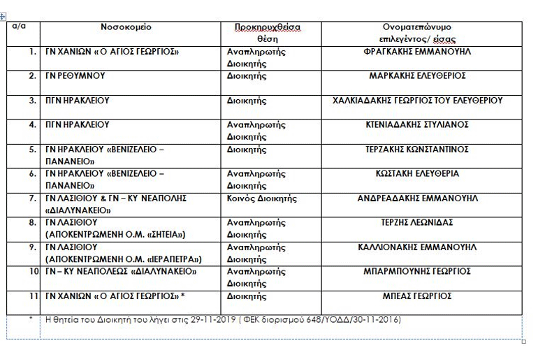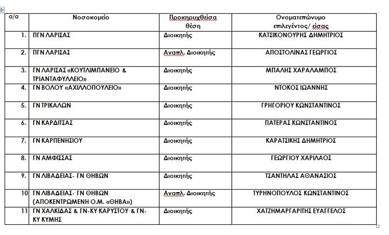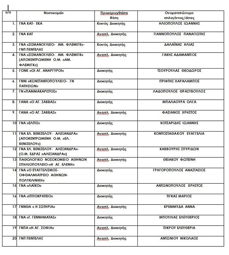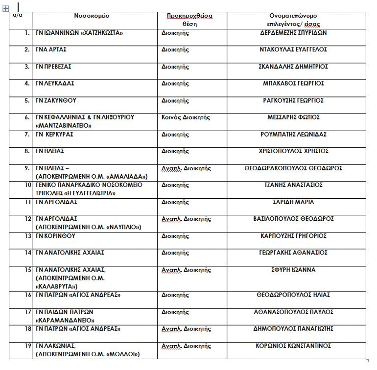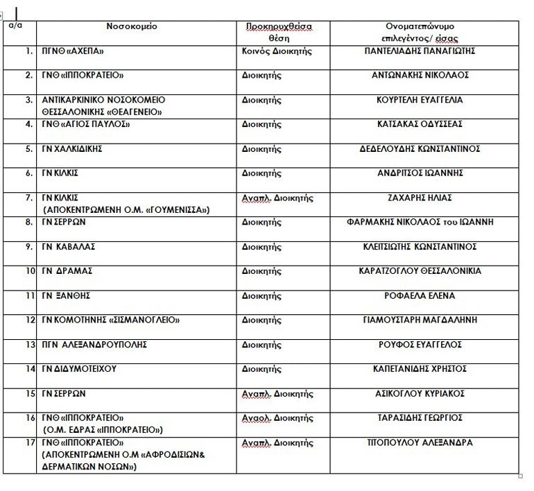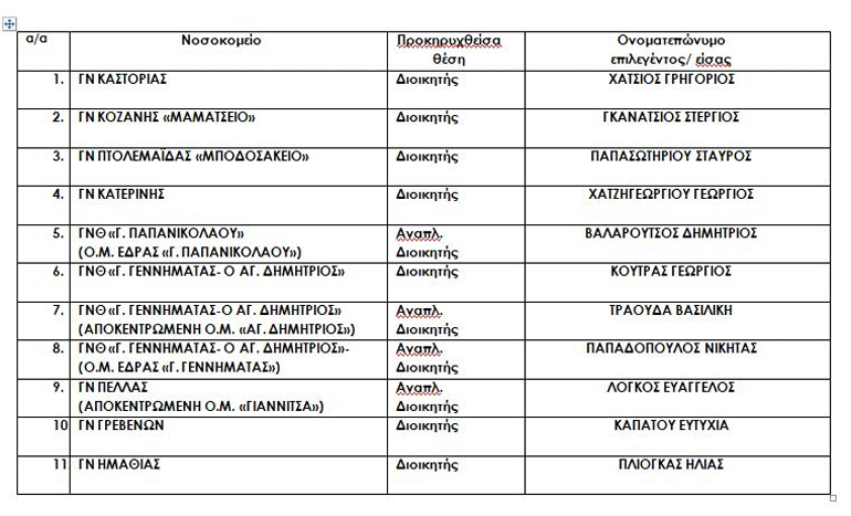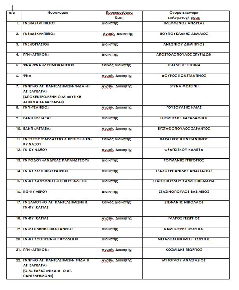 Οι πίνακες, όπως ανακοινώθηκαν από το υπουργείο Υγείας ανά υγειονομική περιφέρεια, με τους διοικητές και υποδιοικητές που αναλαμβάνουν καθήκοντα στα νοσοκομεία:
