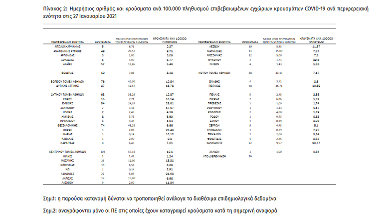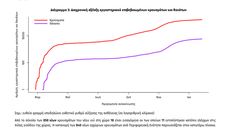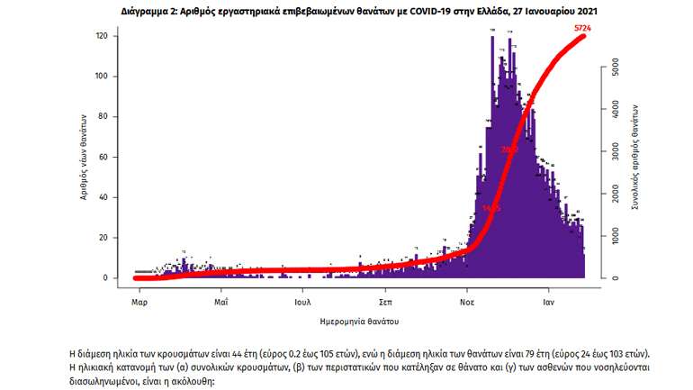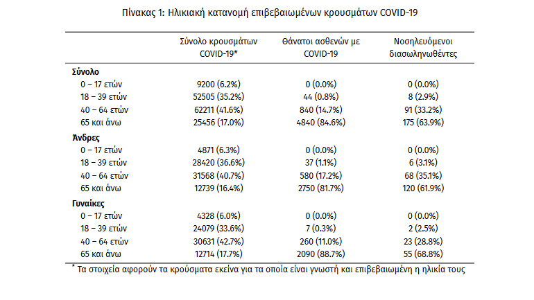 Τέλος, έχουμε 32 νέους θανάτους από τη νόσο COVID-19, φθάνοντας τους 5724 θανάτους συνολικά στη χώρα, εκ των οποίων 3367 (58.8%) άνδρες. Η διάμεση ηλικία των θανόντων συμπολιτών μας ήταν τα 79 έτη και το 95.4% είχε κάποιο υποκείμενο νόσημα ή/και ηλικία 70 ετών και άνω.