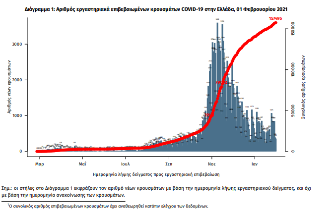 Τα στοιχεία που παρουσιάζονται αφορούν περιστατικά από την επιδημιολογική επιτήρηση της νόσου από το νέο κορωνοϊό (COVID19), με βάση τα δεδομένα που έχουν δηλωθεί στον ΕΟΔΥ και καταγραφεί μέχρι τις 01 Φεβρουαρίου 2021 (ώρα 15:00). Τα νέα εργαστηριακά επιβεβαιωμένα κρούσματα της νόσου είναι 543, εκ των οποίων 12 εντοπίστηκαν κατόπιν ελέγχων στις πύλες εισόδου της χώρας. Ο συνολικός αριθμός των κρουσμάτων ανέρχεται σε 157495 (ημερήσια μεταβολή +0.3%), εκ των οποίων 52.0% άνδρες. 1 Οι νέοι θάνατοι ασθενών με COVID-19 είναι 33, ενώ από την έναρξη της επιδημίας έχουν καταγραφεί συνολικά 5829 θάνατοι. Η διάμεση ηλικία των ασθενών που απεβίωσαν είναι 79 έτη. Ο αριθμός των ασθενών που νοσηλεύονται διασωληνωμένοι είναι 248 (73.4% άνδρες). Η ημερήσια κατανομή των επιβεβαιωμένων κρουσμάτων είναι η ακόλουθη (η γραμμή παριστάνει την συνολική, αθροιστική κατανομή των κρουσμάτων).
