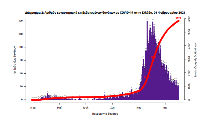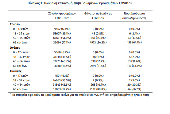 Τέλος, έχουμε 33 νέους θανάτους από τη νόσο COVID-19, φθάνοντας τους 5829 θανάτους συνολικά στη χώρα, εκ των οποίων 3427 (58.8%) άνδρες. Η διάμεση ηλικία των θανόντων συμπολιτών μας ήταν τα 79 έτη και το 95.5% είχε κάποιο υποκείμενο νόσημα ή/και ηλικία 70 ετών και άνω.