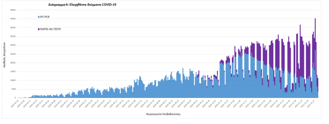 Δείγματα που έχουν ελεγχθεί: Από την 1η Ιανουαρίου 2020 μέχρι σήμερα, στα εργαστήρια που διενεργούν ελέγχους για τον νέο κορωνοϊό (SARS-CoV-2) και που δηλώνουν συστηματικά στον ΕΟΔΥ το σύνολο των δειγμάτων που ελέγχουν, έχουν συνολικά ελεγχθεί 3.137.674 κλινικά δείγματα ενώ από Μονάδες Υγείας και Κλιμάκια του ΕΟΔΥ που διενεργούν ελέγχους Rapid Ag έχουν ελεγχθεί 1.054.992 δείγματα.