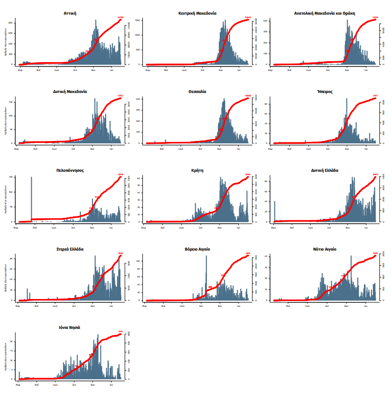 Σημ.: οι στήλες εκφράζουν τον αριθμό νέων κρουσμάτων με βάση την ημερομηνία λήψης εργαστηριακού δείγματος, και όχι με βάση την ημερομηνία ανακοίνωσης των κρουσμάτων.