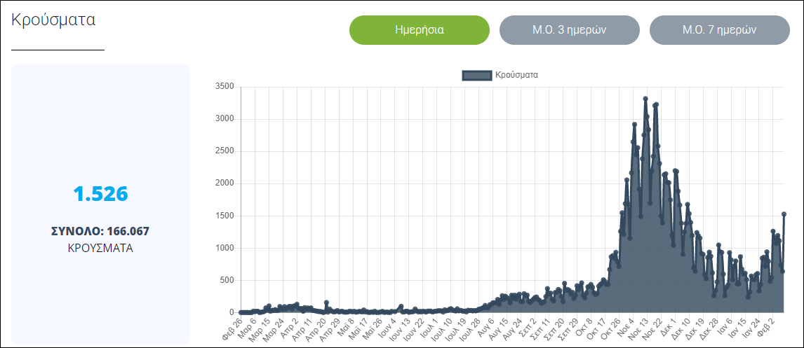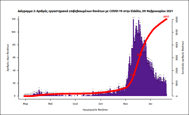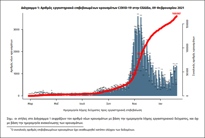 Τα στοιχεία που παρουσιάζονται αφορούν περιστατικά από την επιδημιολογική επιτήρηση της νόσου από το νέο κορωνοϊό (COVID19), με βάση τα δεδομένα που έχουν δηλωθεί στον ΕΟΔΥ και καταγραφεί μέχρι τις 09 Φεβρουαρίου 2021 (ώρα 15:00). Τα νέα εργαστηριακά επιβεβαιωμένα κρούσματα της νόσου είναι 1526, εκ των οποίων 9 εντοπίστηκαν κατόπιν ελέγχων στις πύλες εισόδου της χώρας. Ο συνολικός αριθμός των κρουσμάτων ανέρχεται σε 166067 (ημερήσια μεταβολή +0.9%), εκ των οποίων 51.9% άνδρες. 1 Οι νέοι θάνατοι ασθενών με COVID-19 είναι 20, ενώ από την έναρξη της επιδημίας έχουν καταγραφεί συνολικά 6017 θάνατοι. Η διάμεση ηλικία των ασθενών που απεβίωσαν είναι 79 έτη. Ο αριθμός των ασθενών που νοσηλεύονται διασωληνωμένοι είναι 277 (72.2% άνδρες). Η ημερήσια κατανομή των επιβεβαιωμένων κρουσμάτων είναι η ακόλουθη (η γραμμή παριστάνει την συνολική, αθροιστική κατανομή των κρουσμάτων).