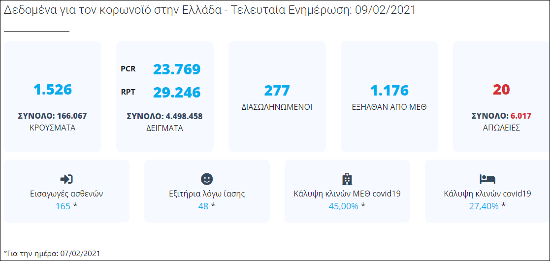 Ημερήσια έκθεση επιδημιολογικής επιτήρησης λοίμωξης από το νέο κορωνοϊό (COVID-19) – Δεδομένα έως 09/02/2021