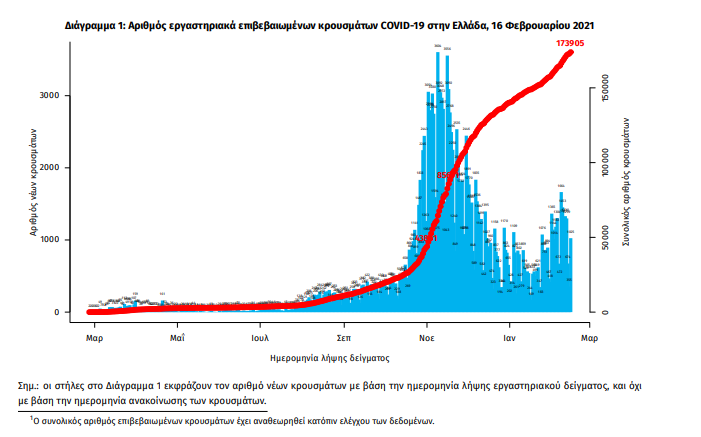Τα στοιχεία που παρουσιάζονται αφορούν περιστατικά από την επιδημιολογική επιτήρηση της νόσου από το νέο κορωνοϊό (COVID19), με βάση τα δεδομένα που έχουν δηλωθεί στον ΕΟΔΥ και καταγραφεί μέχρι τις 16 Φεβρουαρίου 2021 (ώρα 15:00). Τα νέα εργαστηριακά επιβεβαιωμένα κρούσματα της νόσου που καταγράφηκαν τις τελευταίες 24 ώρες είναι 1121, εκ των οποίων 6 εντοπίστηκαν κατόπιν ελέγχων στις πύλες εισόδου της χώρας. Ο συνολικός αριθμός των κρουσμάτων ανέρχεται σε 173905 (ημερήσια μεταβολή +0.6%), εκ των οποίων 51.8% άνδρες. 1 Με βάση τα επιβεβαιωμένα κρούσματα των τελευταίων 7 ημερών, 50 θεωρούνται σχετιζόμενα με ταξίδι από το εξωτερικό και 1800 είναι σχετιζόμενα με ήδη γνωστό κρούσμα. Ημερήσια εξέλιξη της πανδημίας: Η ημερήσια κατανομή των επιβεβαιωμένων κρουσμάτων είναι η ακόλουθη (η γραμμή παριστάνει την συνολική, αθροιστική κατανομή των κρουσμάτων).