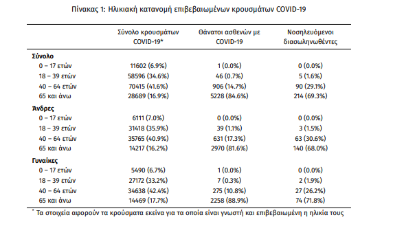 Ο αριθμός των ασθενών που νοσηλεύονται διασωληνωμένοι είναι 309 (66.7% άνδρες). Η διάμεση ηλικία τους είναι 70 έτη. To 87.4% έχει υποκείμενο νόσημα ή/και ηλικία 70 ετών και άνω. Από την αρχή της πανδημίας έχουν εξέλθει από τις ΜΕΘ 1231 ασθενείς. Οι νέες εισαγωγές2 ασθενών Covid-19 στα νοσοκομεία της επικράτειας είναι 190 (ημερήσια μεταβολή -5,47%). Ο μέσος όρος εισαγωγών του επταημέρου είναι 224 ασθενείς. Hλικιακή κατανομή:Η διάμεση ηλικία των κρουσμάτων είναι 44 έτη (εύρος 0.2 έως 105 έτη), ενώ η διάμεση ηλικία των θανόντων είναι 79 έτη (εύρος 15 έως 103 έτη).