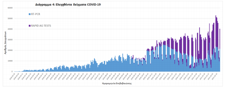 Δείγματα που έχουν ελεγχθεί: Από την 1η Ιανουαρίου 2020 μέχρι σήμερα, στα εργαστήρια που διενεργούν ελέγχους για τον νέο κορωνοϊό (SARS-CoV-2) και που δηλώνουν συστηματικά το σύνολο των δειγμάτων που ελέγχουν, έχουν συνολικά ελεγχθεί 3.411.078 κλινικά δείγματα ενώ από Μονάδες Υγείας και Κλιμάκια του ΕΟΔΥ που διενεργούν ελέγχους Rapid Ag έχουν ελεγχθεί 1.356.605 δείγματα. O μέσος όρος του επταημέρου είναι 38.461 δειγματοληπτικοί έλεγχοι.