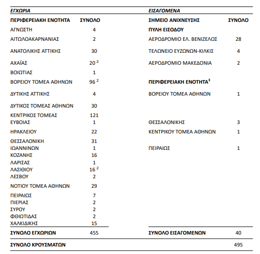 Σημ.1: Το σύνολο έχει προκύψει κατόπιν της αφαίρεσης των δειγμάτων που αφορούσαν επανελέγχους, μετά από την επιδημιολογική διερεύνηση των κρουσμάτων. Σημ.2: Περιλαμβάνονται και κρούσματα που ανήκουν σε γνωστές συρροές Σημ.3: Περιφερειακές Ενότητες όπου ανιχνεύθηκαν θετικά κρούσματα με ιστορικό ταξιδιού από χώρα του εξωτερικού