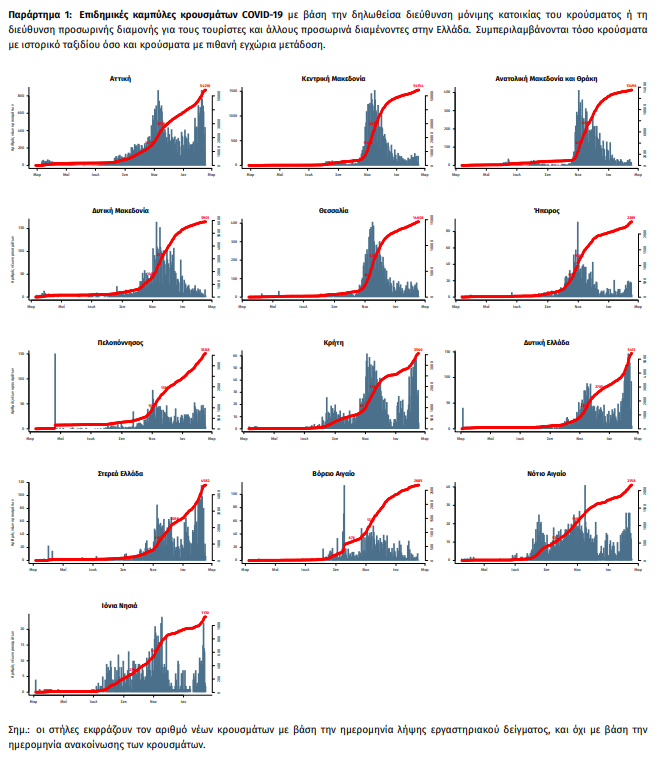 Γεωγραφική διασπορά: Ο χάρτης αποτυπώνει τη γεωγραφική κατανομή των συνολικών κρουσμάτων COVID-19 (από την αρχή της επιδημίας) ανά Περιφερειακή Ενότητα της χώρας, με βάση την δηλωθείσα διεύθυνση μόνιμης κατοικίας του ασθενούς, ή τη διεύθυνση προσωρινής διαμονής για τους τουρίστες και άλλους προσωρινά διαμένοντες στην Ελλάδα. Συμπεριλαμβάνονται τόσο κρούσματα με ιστορικό ταξιδίου (“εισαγόμενα”) όσο και κρούσματα με πιθανή εγχώρια μετάδοση.