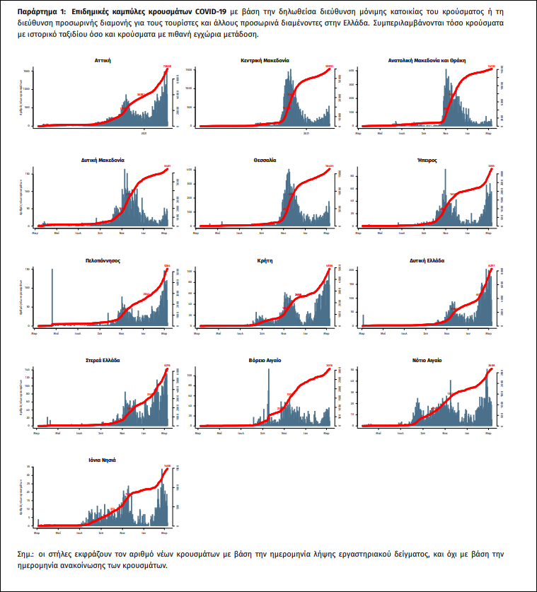 Γεωγραφική διασπορά: Ο χάρτης αποτυπώνει τη γεωγραφική κατανομή των συνολικών κρουσμάτων COVID-19 (από την αρχή της επιδημίας) ανά Περιφερειακή Ενότητα της χώρας, με βάση την δηλωθείσα διεύθυνση μόνιμης κατοικίας του ασθενούς, ή τη διεύθυνση προσωρινής διαμονής για τους τουρίστες και άλλους προσωρινά διαμένοντες στην Ελλάδα. Συμπεριλαμβάνονται τόσο κρούσματα με ιστορικό ταξιδίου (“εισαγόμενα”) όσο και κρούσματα με πιθανή εγχώρια μετάδοση.