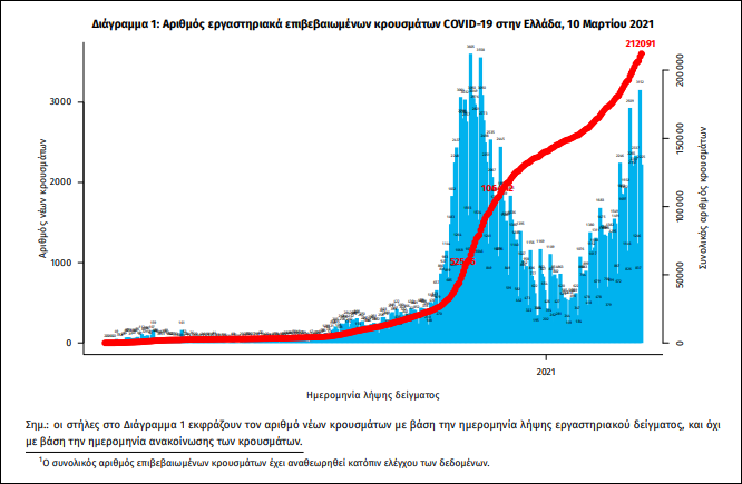 Τα στοιχεία που παρουσιάζονται αφορούν περιστατικά από την επιδημιολογική επιτήρηση της νόσου από το νέο κορωνοϊό (COVID19), με βάση τα δεδομένα που έχουν δηλωθεί στον ΕΟΔΥ και καταγραφεί μέχρι τις 10 Μαρτίου 2021 (ώρα 15:00). Τα νέα εργαστηριακά επιβεβαιωμένα κρούσματα της νόσου που καταγράφηκαν τις τελευταίες 24 ώρες είναι 2.633, εκ των οποίων 7 εντοπίστηκαν κατόπιν ελέγχων στις πύλες εισόδου της χώρας.