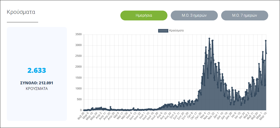 Σήμερα, Τετάρτη 10 Μαρτίου, ο Εθνικός Οργανισμός Δημόσιας Υγείας ανακοίνωσε 2.633 νέα κρούσματα Covid-19 στην Ελλάδα, αριθμός αρκετά μικρότερος από τα 3.215 που καταγράφηκαν το προηγούμενο 24ωρο.