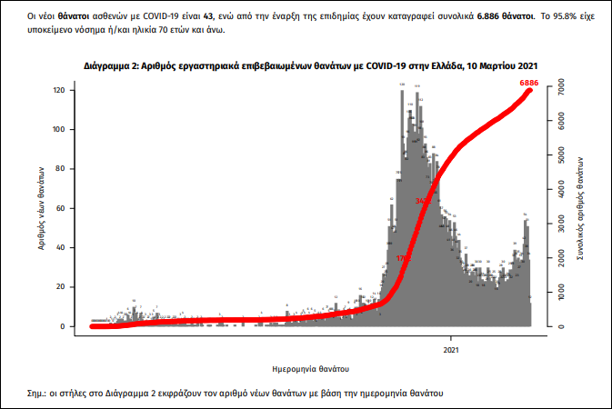 Οι νέοι θάνατοι ασθενών με COVID-19 είναι 43, ενώ από την έναρξη της επιδημίας έχουν καταγραφεί συνολικά 6.886 θάνατοι. Το 95.8% είχε υποκείμενο νόσημα ή/και ηλικία 70 ετών και άνω.