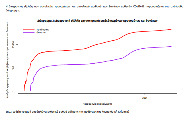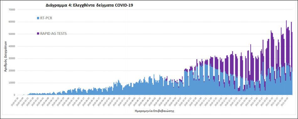 Δείγματα που έχουν ελεγχθεί: Από την 1η Ιανουαρίου 2020 μέχρι σήμερα, στα εργαστήρια που διενεργούν ελέγχους για τον νέο κορωνοϊό (SARS-CoV-2) και που δηλώνουν συστηματικά το σύνολο των δειγμάτων που ελέγχουν, έχουν συνολικά ελεγχθεί 3.855.184 κλινικά δείγματα ενώ από Μονάδες Υγείας και Κλιμάκια του ΕΟΔΥ που διενεργούν ελέγχους Rapid Ag έχουν ελεγχθεί 1.834.637 δείγματα. O μέσος όρος του επταημέρου είναι 45.745 δειγματοληπτικοί έλεγχοι.