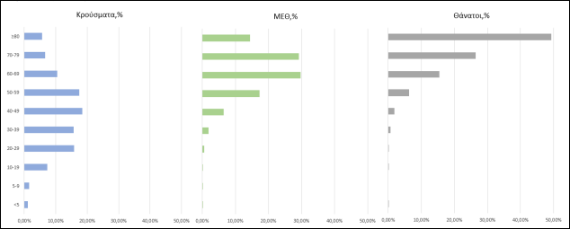 Ακολούθως παρουσιάζεται η ηλικιακή κατανομή των (α) συνολικών κρουσμάτων, (β) των περιστατικών που κατέληξαν σε θάνατο και (γ) των ασθενών που νοσηλεύονται διασωληνωμένοι: