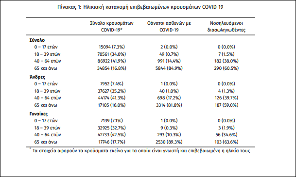 Hλικιακή κατανομή: Η διάμεση ηλικία των κρουσμάτων είναι 44 έτη (εύρος 0.2 έως 105 έτη), ενώ η διάμεση ηλικία των θανόντων είναι 79 έτη (εύρος 0 έως 103 έτη).