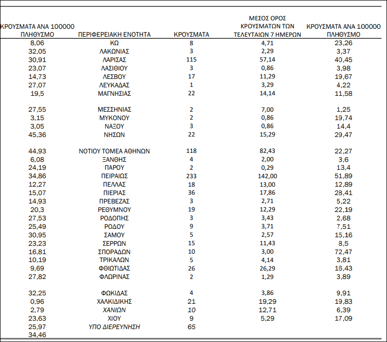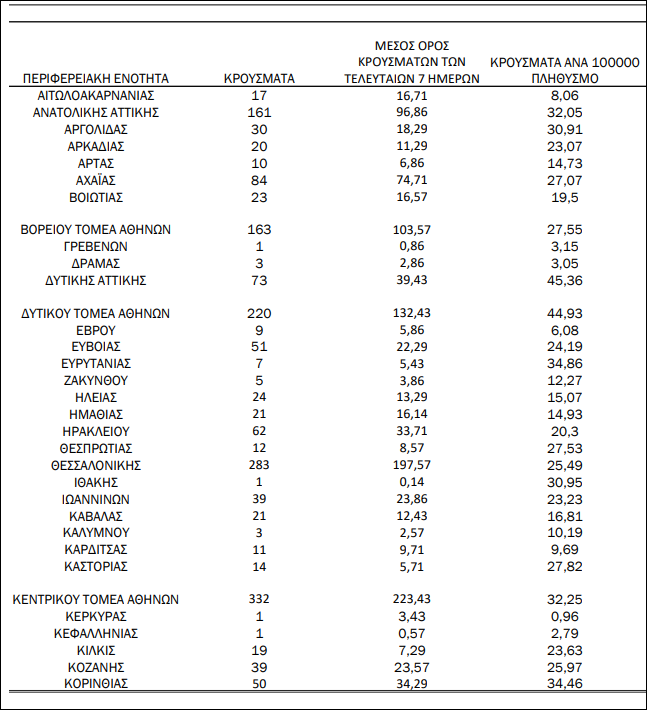 Κατανομή ανακοινωθέντων εγχώριων κρουσμάτων: Από το σύνολο των 2.633 νέων κρουσμάτων του νέου ιού στη χώρα 8 είναι εισαγόμενα εκ των οποίων 7 εντοπίστηκαν κατόπιν ελέγχων στις πύλες εισόδου της χώρας. Η κατανομή των 2.625 νέων εγχώριων κρουσμάτων ανά Περιφερειακή Ενότητα παρουσιάζεται στον κατωτέρω πίνακα.