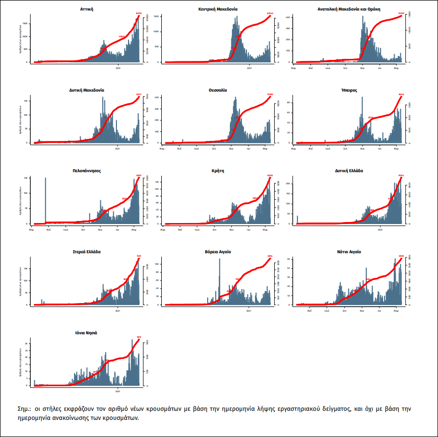 Παράρτημα 1: Επιδημικές καμπύλες κρουσμάτων COVID-19 με βάση την δηλωθείσα διεύθυνση μόνιμης κατοικίας του κρούσματος ή τη διεύθυνση προσωρινής διαμονής για τους τουρίστες και άλλους προσωρινά διαμένοντες στην Ελλάδα. Συμπεριλαμβάνονται τόσο κρούσματα με ιστορικό ταξιδίου όσο και κρούσματα με πιθανή εγχώρια μετάδοση.