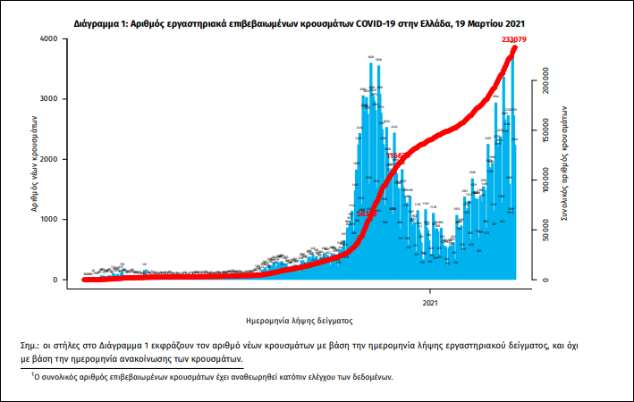 Τα στοιχεία που παρουσιάζονται αφορούν περιστατικά από την επιδημιολογική επιτήρηση της νόσου από το νέο κορωνοϊό (COVID19), με βάση τα δεδομένα που έχουν δηλωθεί στον ΕΟΔΥ και καταγραφεί μέχρι τις 19 Μαρτίου 2021 (ώρα 15:00). Τα νέα εργαστηριακά επιβεβαιωμένα κρούσματα της νόσου που καταγράφηκαν τις τελευταίες 24 ώρες είναι 2.785, εκ των οποίων 16 εντοπίστηκαν κατόπιν ελέγχων στις πύλες εισόδου της χώρας. Ο συνολικός αριθμός των κρουσμάτων ανέρχεται σε 233.079 (ημερήσια μεταβολή +1.2%), εκ των οποίων 51.6% άνδρες. 1 Με βάση τα επιβεβαιωμένα κρούσματα των τελευταίων 7 ημερών, 75 θεωρούνται σχετιζόμενα με ταξίδι από το εξωτερικό και 2.101 είναι σχετιζόμενα με ήδη γνωστό κρούσμα. Ημερήσια εξέλιξη της πανδημίας: Η ημερήσια κατανομή των επιβεβαιωμένων κρουσμάτων είναι η ακόλουθη (η γραμμή παριστάνει την συνολική, αθροιστική κατανομή των κρουσμάτων).