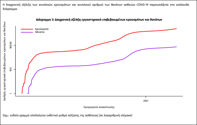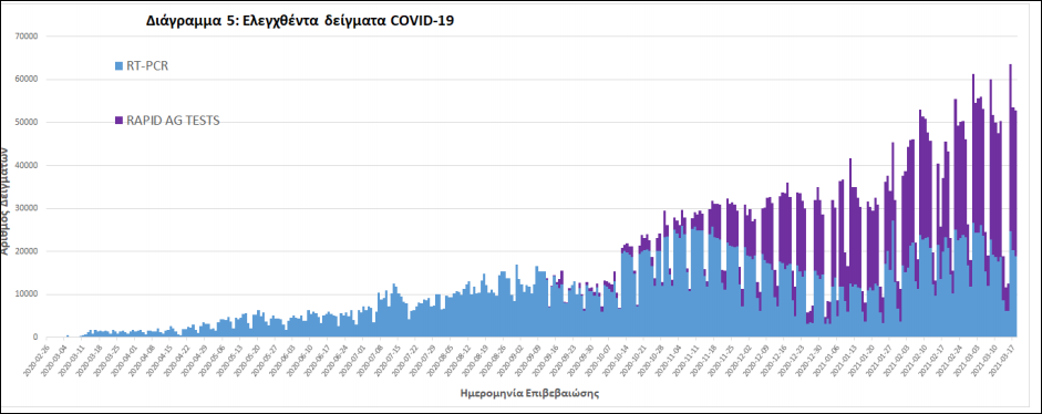 Δείγματα που έχουν ελεγχθεί: Από την 1η Ιανουαρίου 2020 μέχρι σήμερα, στα εργαστήρια που διενεργούν ελέγχους για τον νέο κορωνοϊό (SARS-CoV-2) και που δηλώνουν συστηματικά το σύνολο των δειγμάτων που ελέγχουν, έχουν συνολικά ελεγχθεί 3.995.312 κλινικά δείγματα ενώ από Μονάδες Υγείας και Κλιμάκια του ΕΟΔΥ που διενεργούν ελέγχους Rapid Ag έχουν ελεγχθεί 2.055.589 δείγματα. O μέσος όρος του επταημέρου είναι 37.635 δειγματοληπτικοί έλεγχοι.