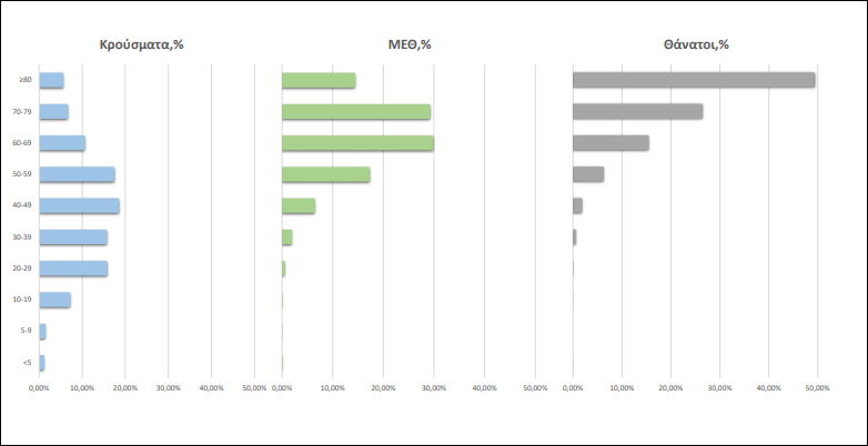 Διάγραμμα 4: Ηλικιακή Κατανομή κρουσμάτων, νοσηλευόμενων στις MEΘ και ασθενών που απεβίωσαν από την αρχή της πανδημίας.