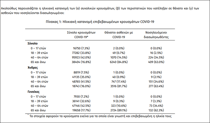 Ο αριθμός των ασθενών που νοσηλεύονται διασωληνωμένοι είναι 649 (67.3% άνδρες). Η διάμεση ηλικία τους είναι 68 έτη. To 82.6% έχει υποκείμενο νόσημα ή/και ηλικία 70 ετών και άνω. Από την αρχή της πανδημίας έχουν εξέλθει από τις ΜΕΘ 1.555 ασθενείς. Οι εισαγωγές νέων ασθενών Covid-19 στα νοσοκομεία της επικράτειας είναι 507 (ημερήσια μεταβολή -3.43%). Ο μέσος όρος εισαγωγών του επταημέρου είναι 459 ασθενείς.Η διάμεση ηλικία των κρουσμάτων είναι 44 έτη (εύρος 0.2 έως 105 έτη), ενώ η διάμεση ηλικία των θανόντων είναι 79 έτη (εύρος 0 έως 103 έτη).