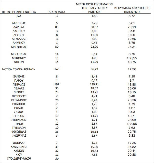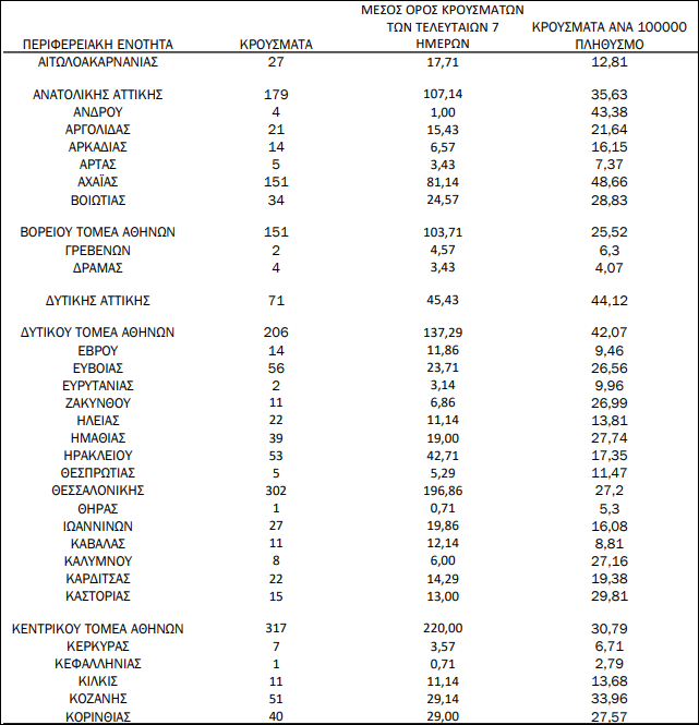 Κατανομή ανακοινωθέντων εγχώριων κρουσμάτων: Από το σύνολο των 2.785 νέων κρουσμάτων του νέου ιού στη χώρα 16 είναι εισαγόμενα εκ των οποίων 16 εντοπίστηκαν κατόπιν ελέγχων στις πύλες εισόδου της χώρας. Η κατανομή των 2.769 νέων εγχώριων κρουσμάτων ανά Περιφερειακή Ενότητα παρουσιάζεται στον κατωτέρω πίνακα.3