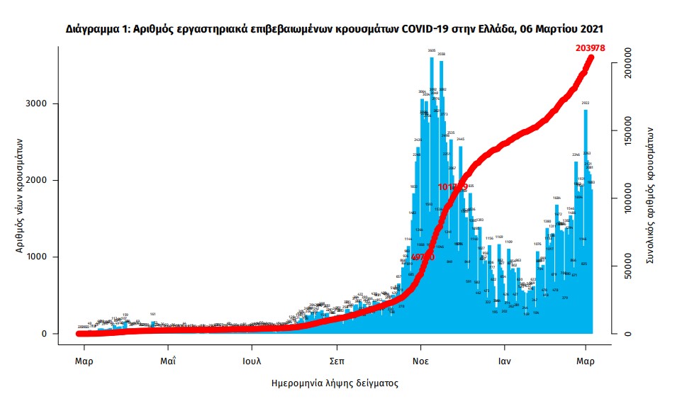 «Τα νέα εργαστηριακά επιβεβαιωμένα κρούσματα της νόσου που καταγράφηκαν τις τελευταίες 24 ώρες είναι 2.301, εκ των οποίων 14 εντοπίστηκαν κατόπιν ελέγχων στις πύλες εισόδου της χώρας. Ο συνολικός αριθμός των κρουσμάτων ανέρχεται σε 203.978 (ημερήσια μεταβολή +1.1%), εκ των οποίων 51.7% άνδρες. Με βάση τα επιβεβαιωμένα κρούσματα των τελευταίων 7 ημερών, 72 θεωρούνται σχετιζόμενα με ταξίδι από το εξωτερικό και 3.231 είναι σχετιζόμενα με ήδη γνωστό κρούσμα.