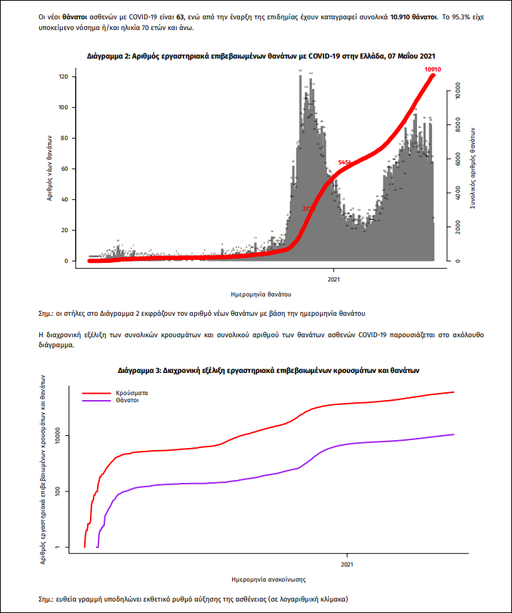 Τα στοιχεία που παρουσιάζονται αφορούν περιστατικά από την επιδημιολογική επιτήρηση της νόσου από τον νέο κορωνοϊό (COVID19), με βάση τα δεδομένα που έχουν δηλωθεί στον ΕΟΔΥ και καταγραφεί μέχρι τις 07 Μαΐου 2021 (ώρα 15:00). Τα νέα εργαστηριακά επιβεβαιωμένα κρούσματα της νόσου που καταγράφηκαν τις τελευταίες 24 ώρες είναι 2.691, εκ των οποίων 7 εντοπίστηκαν κατόπιν ελέγχων στις πύλες εισόδου της χώρας. Ο συνολικός αριθμός των κρουσμάτων ανέρχεται σε 358.116 (ημερήσια μεταβολή +0.8%), εκ των οποίων 51.2% άνδρες. Με βάση τα επιβεβαιωμένα κρούσματα των τελευταίων 7 ημερών, 53 θεωρούνται σχετιζόμενα με ταξίδι από το εξωτερικό και 1.705 είναι σχετιζόμενα με ήδη γνωστό κρούσμα. Ημερήσια εξέλιξη της πανδημίας: Η ημερήσια κατανομή των επιβεβαιωμένων κρουσμάτων είναι η ακόλουθη (η γραμμή παριστάνει την συνολική, αθροιστική κατανομή των κρουσμάτων).