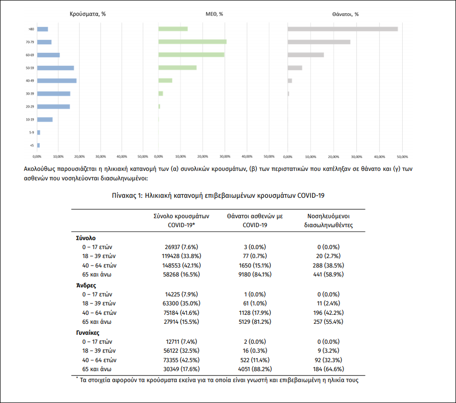 Ο αριθμός των ασθενών που νοσηλεύονται διασωληνωμένοι είναι 749 (62.1% άνδρες). Η διάμεση ηλικία τους είναι 67 έτη. To 83.2% έχει υποκείμενο νόσημα ή/και ηλικία 70 ετών και άνω. Από την αρχή της πανδημίας έχουν εξέλθει από τις ΜΕΘ 2.165 ασθενείς. Οι εισαγωγές νέων ασθενών Covid-19 στα νοσοκομεία της επικράτειας είναι 392 (ημερήσια μεταβολή +5.95%). Ο μέσος όρος εισαγωγών του επταημέρου είναι 391 ασθενείς.Η διάμεση ηλικία των κρουσμάτων είναι 44 έτη (εύρος 0.2 έως 106 έτη), ενώ η διάμεση ηλικία των θανόντων είναι 78 έτη (εύρος 0.2 έως 106 έτη).