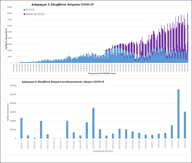 Δείγματα που έχουν ελεγχθεί: Από την 1η Ιανουαρίου 2020 μέχρι σήμερα, στα εργαστήρια που διενεργούν ελέγχους για τον νέο κορωνοϊό (SARS-CoV-2) και που δηλώνουν συστηματικά το σύνολο των δειγμάτων που ελέγχουν, έχουν συνολικά ελεγχθεί 4.736.061 κλινικά δείγματα ενώ από Μονάδες Υγείας και Κλιμάκια του ΕΟΔΥ που διενεργούν ελέγχους Rapid Ag έχουν ελεγχθεί 3.650.679 δείγματα. O μέσος όρος του επταημέρου είναι 35.797 δειγματοληπτικοί έλεγχοι.