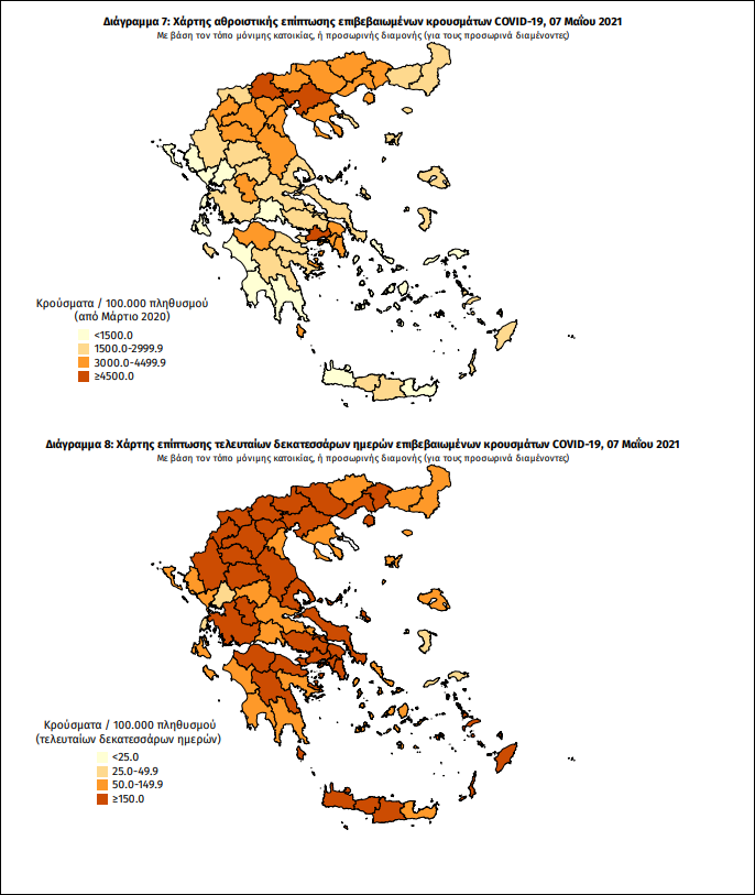 Πίνακας 2: Ημερήσιος αριθμός και κρούσματα ανά 100.000 πληθυσμού επιβεβαιωμένων εγχώριων κρουσμάτων COVID-19 ανά περιφερειακή ενότητα στις 07 Μαΐου 2021.