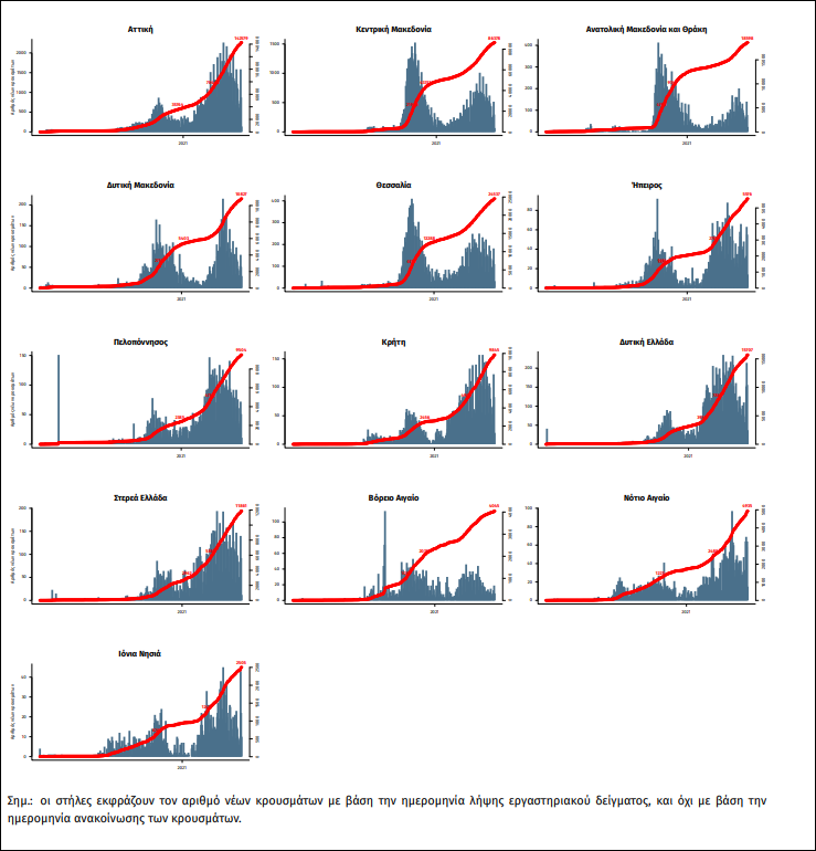 Παράρτημα 1: Επιδημικές καμπύλες κρουσμάτων COVID-19 με βάση την δηλωθείσα διεύθυνση μόνιμης κατοικίας του κρούσματος ή τη διεύθυνση προσωρινής διαμονής για τους τουρίστες και άλλους προσωρινά διαμένοντες στην Ελλάδα. Συμπεριλαμβάνονται τόσο κρούσματα με ιστορικό ταξιδίου όσο και κρούσματα με πιθανή εγχώρια μετάδοση.