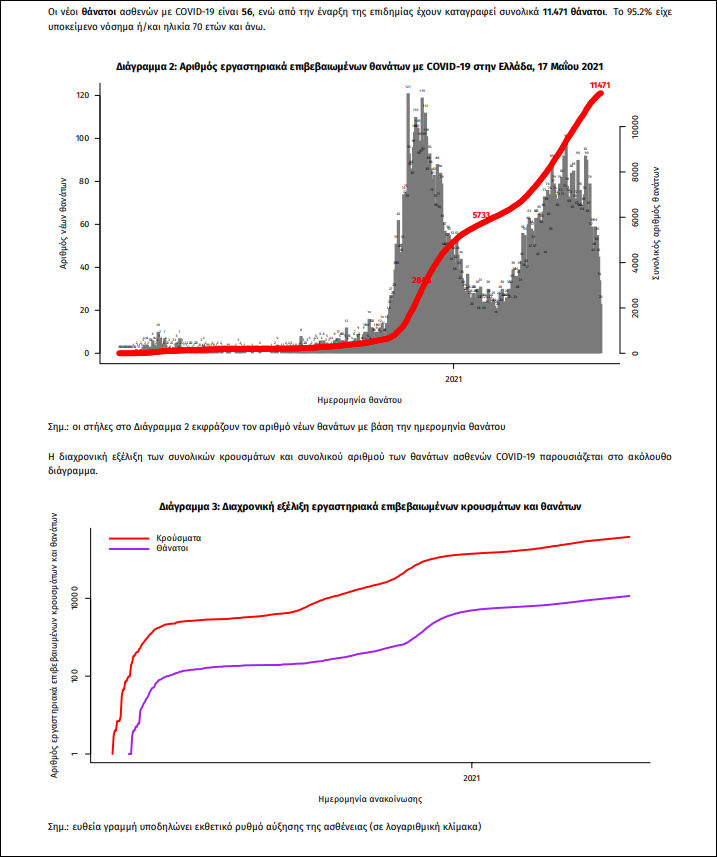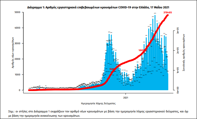 Τα στοιχεία που παρουσιάζονται αφορούν περιστατικά από την επιδημιολογική επιτήρηση της νόσου από τον νέο κορωνοϊό (COVID19), με βάση τα δεδομένα που έχουν δηλωθεί στον ΕΟΔΥ και καταγραφεί μέχρι τις 17 Μαΐου 2021 (ώρα 15:00). Τα νέα εργαστηριακά επιβεβαιωμένα κρούσματα της νόσου που καταγράφηκαν τις τελευταίες 24 ώρες είναι 1.402, εκ των οποίων 4 εντοπίστηκαν κατόπιν ελέγχων στις πύλες εισόδου της χώρας. Ο συνολικός αριθμός των κρουσμάτων ανέρχεται σε 378.485 (ημερήσια μεταβολή +0.4%), εκ των οποίων 51.2% άνδρες. Με βάση τα επιβεβαιωμένα κρούσματα των τελευταίων 7 ημερών, 38 θεωρούνται σχετιζόμενα με ταξίδι από το εξωτερικό και 2.324 είναι σχετιζόμενα με ήδη γνωστό κρούσμα. Ημερήσια εξέλιξη της πανδημίας: Η ημερήσια κατανομή των επιβεβαιωμένων κρουσμάτων είναι η ακόλουθη (η γραμμή παριστάνει την συνολική, αθροιστική κατανομή των κρουσμάτων).