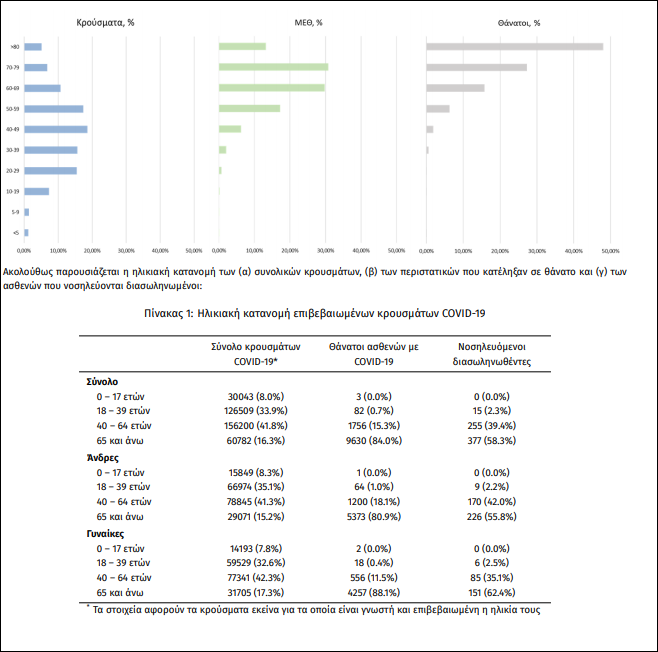 Ο αριθμός των ασθενών που νοσηλεύονται διασωληνωμένοι είναι 647 (62.6% άνδρες). Η διάμεση ηλικία τους είναι 67 έτη. To 83.0% έχει υποκείμενο νόσημα ή/και ηλικία 70 ετών και άνω. Από την αρχή της πανδημίας έχουν εξέλθει από τις ΜΕΘ 2.287 ασθενείς. Οι εισαγωγές νέων ασθενών Covid-19 στα νοσοκομεία της επικράτειας είναι 318 (ημερήσια μεταβολή +10.8%). Ο μέσος όρος εισαγωγών του επταημέρου είναι 313 ασθενείς. Η διάμεση ηλικία των κρουσμάτων είναι 44 έτη (εύρος 0.2 έως 106 έτη), ενώ η διάμεση ηλικία των θανόντων είναι 78 έτη (εύρος 0.2 έως 106 έτη).