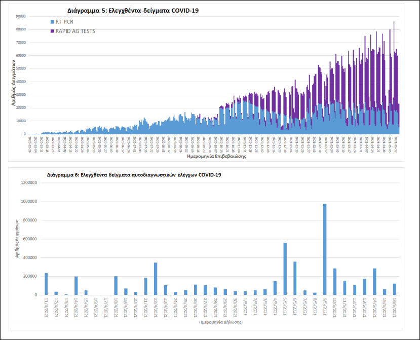 Δείγματα που έχουν ελεγχθεί: Από την 1η Ιανουαρίου 2020 μέχρι σήμερα, στα εργαστήρια που διενεργούν ελέγχους για τον νέο κορωνοϊό (SARS-CoV-2) και που δηλώνουν συστηματικά το σύνολο των δειγμάτων που ελέγχουν, έχουν συνολικά ελεγχθεί 4.878.869 κλινικά δείγματα ενώ από Μονάδες Υγείας και Κλιμάκια του ΕΟΔΥ που διενεργούν ελέγχους Rapid Ag έχουν ελεγχθεί 4.000.639 δείγματα. O μέσος όρος του επταημέρου είναι 54.689 δειγματοληπτικοί έλεγχοι.