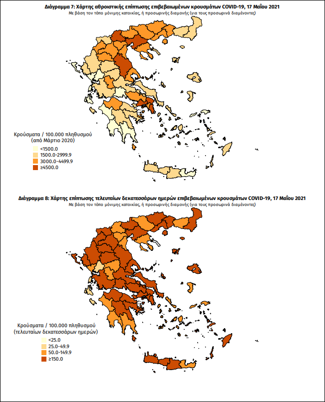 Πίνακας 2: Ημερήσιος αριθμός και κρούσματα ανά 100.000 πληθυσμού επιβεβαιωμένων εγχώριων κρουσμάτων COVID-19 ανά περιφερειακή ενότητα στις 17 Μαΐου 2021.