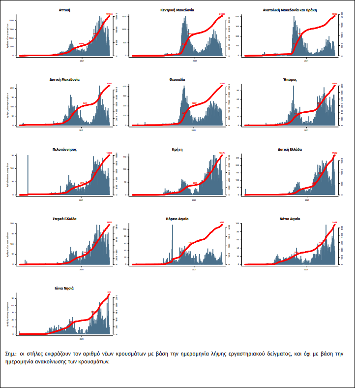Παράρτημα 1: Επιδημικές καμπύλες κρουσμάτων COVID-19 με βάση την δηλωθείσα διεύθυνση μόνιμης κατοικίας του κρούσματος ή τη διεύθυνση προσωρινής διαμονής για τους τουρίστες και άλλους προσωρινά διαμένοντες στην Ελλάδα. Συμπεριλαμβάνονται τόσο κρούσματα με ιστορικό ταξιδίου όσο και κρούσματα με πιθανή εγχώρια μετάδοση.