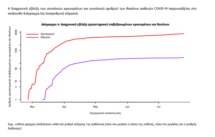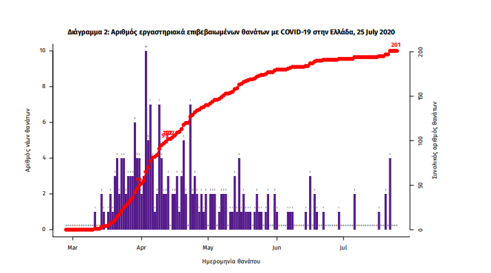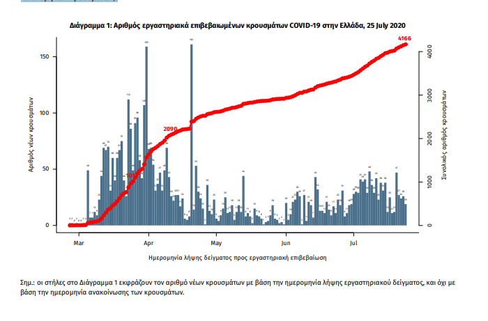Τα στοιχεία που παρουσιάζονται αφορούν περιστατικά από την επιδημιολογική επιτήρηση της νόσου από το νέο κορωνοϊό (COVID19), με βάση τα δεδομένα που έχουν δηλωθεί στον ΕΟΔΥ και καταγραφεί μέχρι τις 25 July 2020 (ώρα 15:00). Τα νέα εργαστηριακά επιβεβαιωμένα κρούσματα της νόσου είναι 31, εκ των οποίων τα 8 εντοπίστηκαν κατόπιν ελέγχων στις πύλες εισόδου της χώρας. Ο συνολικός αριθμός των κρουσμάτων ανέρχεται σε 4166 (ημερήσια μεταβολή +0.7%), εκ των οποίων 54.6% άνδρες. Δεν έχει καταγραφεί κανένας νέος θάνατος ασθενούς με COVID-19, ενώ από την έναρξη της επιδημίας έχουν καταγραφεί συνολικά 201 θάνατοι. Η μέση ηλικία των ασθενών που απεβίωσαν είναι 76 έτη. Ο αριθμός των ασθενών που νοσηλεύονται διασωληνωμένοι είναι 10 (80.0% άνδρες). Η ημερήσια κατανομή των επιβεβαιωμένων κρουσμάτων είναι η ακόλουθη (η γραμμή παριστάνει την συνολική, αθροιστική κατανομή των κρουσμάτων).
