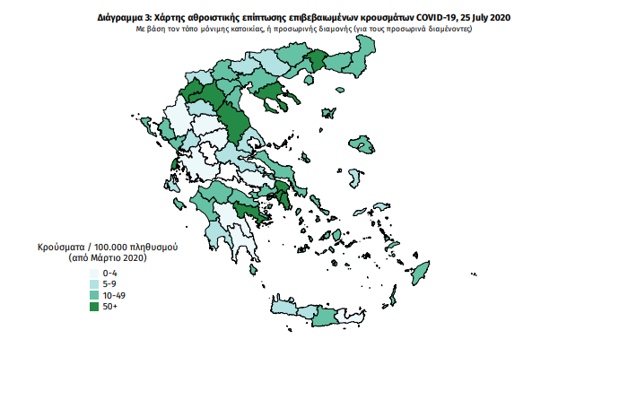 Ο χάρτης αποτυπώνει τη γεωγραφική κατανομή των συνολικών κρουσμάτων COVID-19 (από την αρχή της επιδημίας) ανά Περιφερειακή Ενότητα της χώρας, με βάση την δηλωθείσα διεύθυνση μόνιμης κατοικίας του ασθενούς, ή τη διεύθυνση προσωρινής διαμονής για τους τουρίστες και άλλους προσωρινά διαμένοντες στην Ελλάδα. Συμπεριλαμβάνονται τόσο κρούσματα με ιστορικό ταξιδίου (“εισαγόμενα”) όσο και κρούσματα με πιθανή εγχώρια μετάδοση.