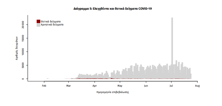 Δείγματα που έχουν ελεγχθεί στα συνεργαζόμενα με τον ΕΟΔΥ εργαστήρια: Από την 1η Ιανουαρίου 2020 μέχρι σήμερα, στα εργαστήρια που διενεργούν ελέγχους για τον νέο κορωνοϊό (SARS-CoV-2) και που δηλώνουν συστηματικά στον ΕΟΔΥ το σύνολο των δειγμάτων που ελέγχουν (θετικά και αρνητικά), έχουν συνολικά ελεγχθεί 440156 κλινικά δείγματα, εκ των οποίων τα 6287 (1.4%) ήταν θετικά στον κορωνοϊό (συμπεριλαμβάνονται και περισσότερα από ένα δείγματα ανά άτομο που ελέγχθηκε).