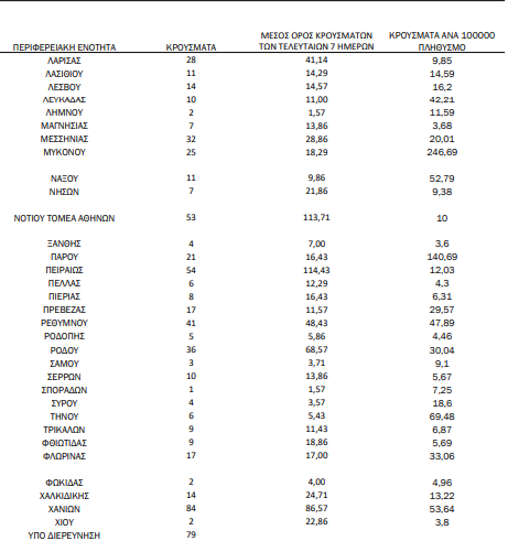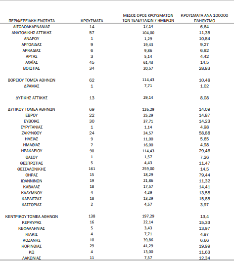Η γεωγραφική κατανομή των κρουσμάτων παρουσιάζεται στον παρακάτω πίνακα.