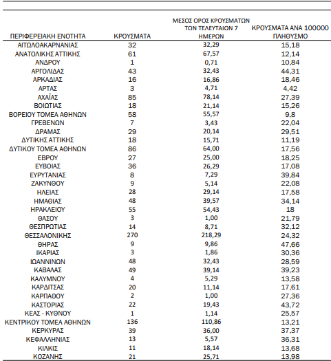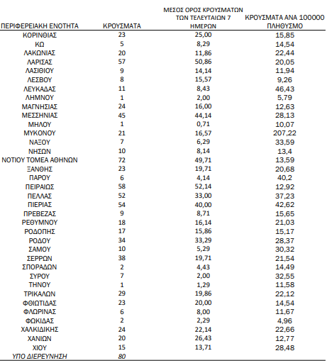 Η γεωγραφική κατανομή των κρουσμάτων παρουσιάζεται στον παρακάτω πίνακα:
