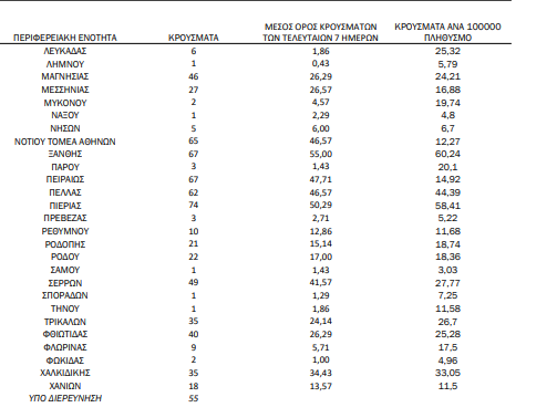 Υπενθυμίζεται πως τα περισσότερα σε αριθμό περιστατικά που έχει καταγράψει ο ΕΟΔΥ σε μία ημέρα ανακοινώθηκαν στις 24 Αυγούστου 2021, όταν εντοπίστηκαν 4.608 περιπτώσεις σε ένα 24ωρο. Επίσης, ο μεγαλύτερος αριθμός θανάτων εξαιτίας του ιού σε ένα 24ωρο καταγράφηκε το Σάββατο 28 Νοεμβρίου, όταν έχασαν τη ζωή τους 121 ασθενείς.